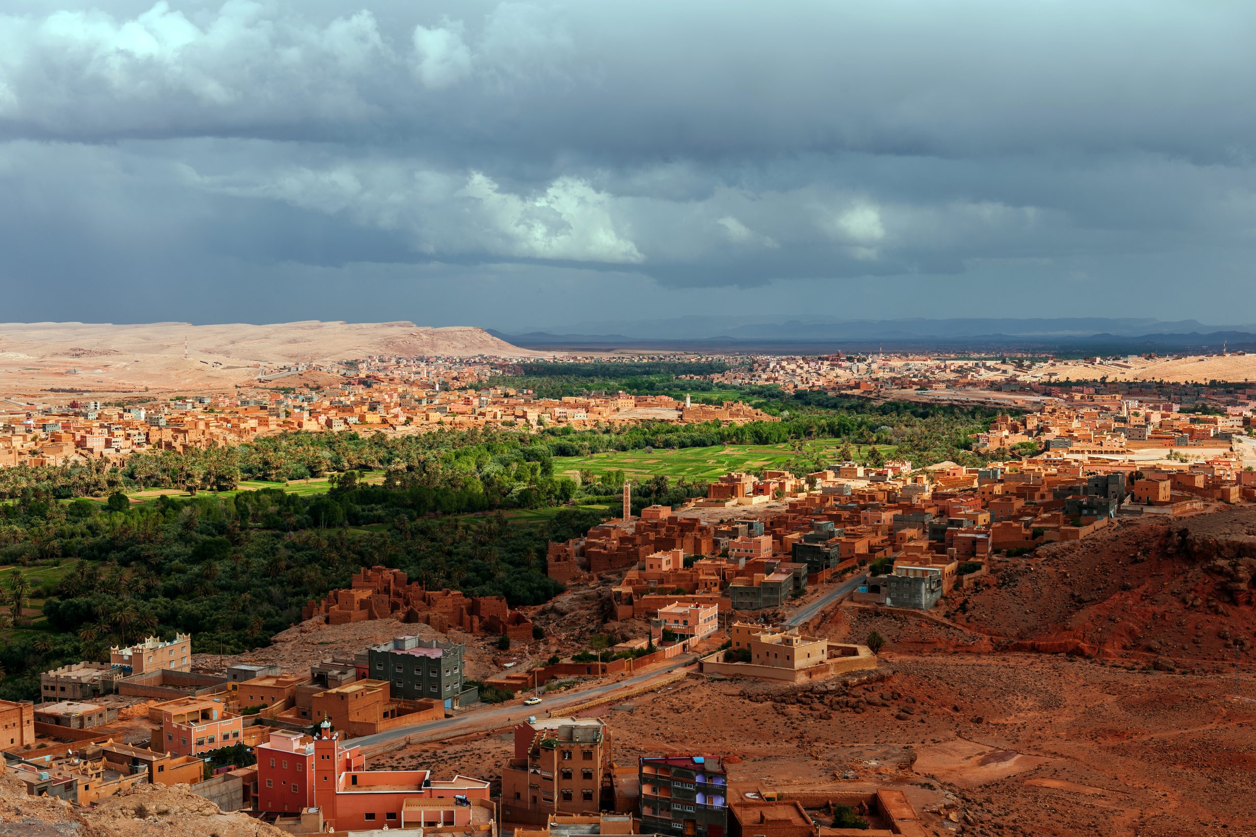 Ouarzazate boasts a significant role in the history of the south of Morocco, lying as it does at the confluence of the three major southern oasis valleys – the Draa, the Dades, and the Ouarzazate. Extensive fortifications built by successive sultans trying to dominate and control this traditionally subversive region have come and gone, the pisé walls washed away in sporadic rains. The only lasting impression has been left by the French, who made Ouarzazate their southern garrison town, laid out a grid of streets, and built modern buildings to line them. There are, however, a couple of well-preserved kasbahs in and around the town, and Ouarzazate is a great base for exploring the surrounding scenery: steep desert valleys filled with palms, leading into rocky desert plains. Close to Ouarzazate lies the spectacular ancient ksar town of Ait Ben Haddou, an extraordinary example of traditional clay-brick dwellings in the foothills of the High Atlas Mountains.